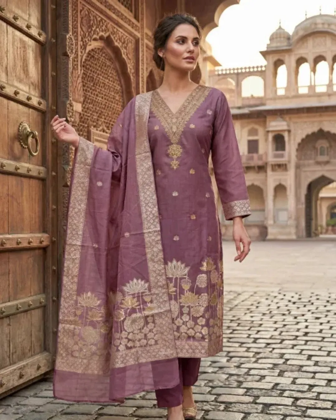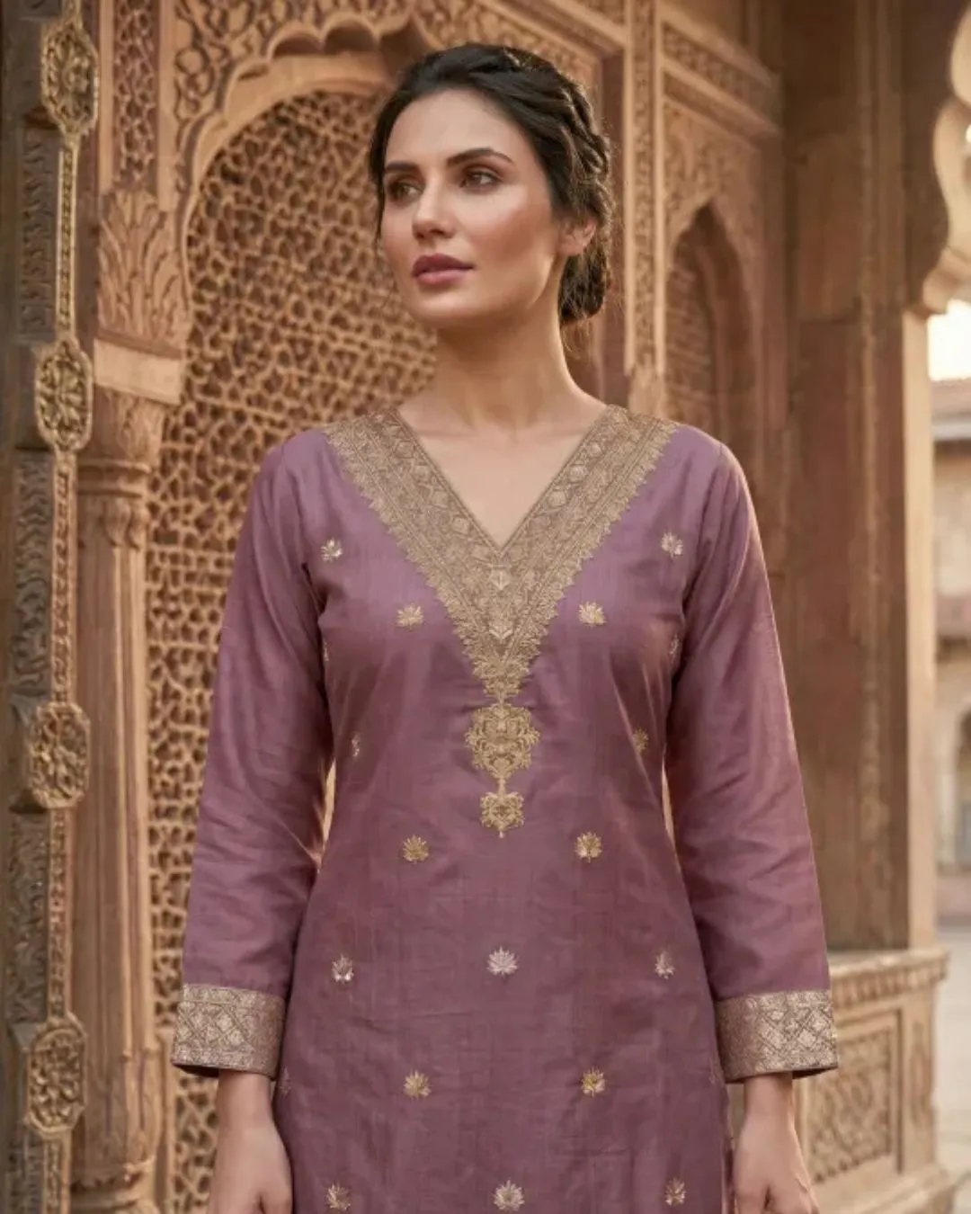 Step into timeless elegance with this stunning mauve kurta set, crafted to bring together traditional artistry and modern sophistication. The kurta features intricate golden embroidery along the neckline, sleeves, and hem, highlighted with delicate floral motifs that add a luxurious ethnic charm.The ensemble is paired with matching straight-fit pants and a beautifully woven dupatta adorned with rich border detailing, enhancing the regal appeal of the outfit. The soft, breathable fabric ensures comfort while maintaining a graceful silhouette.